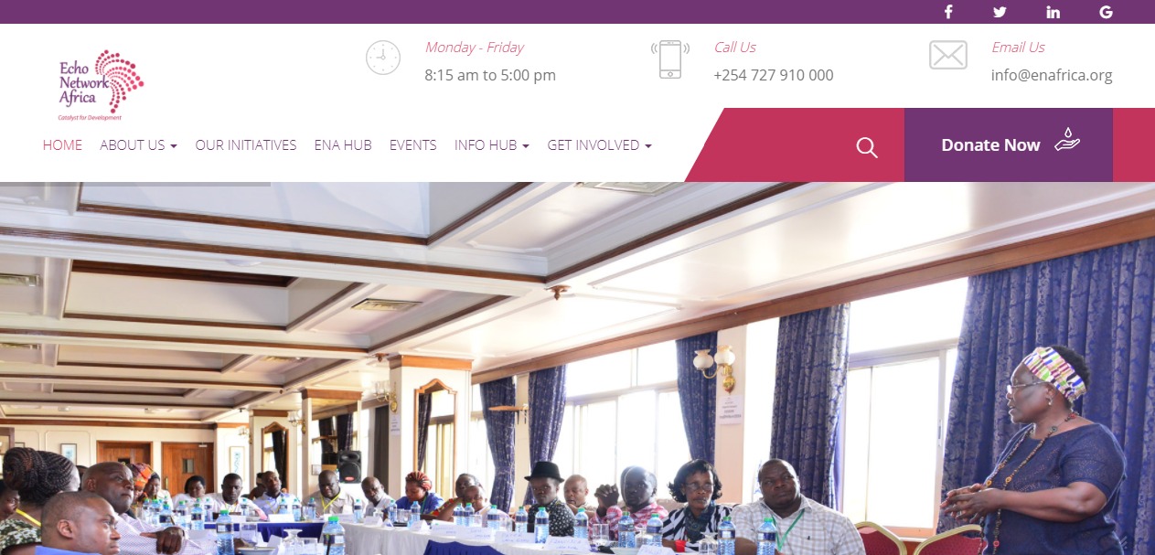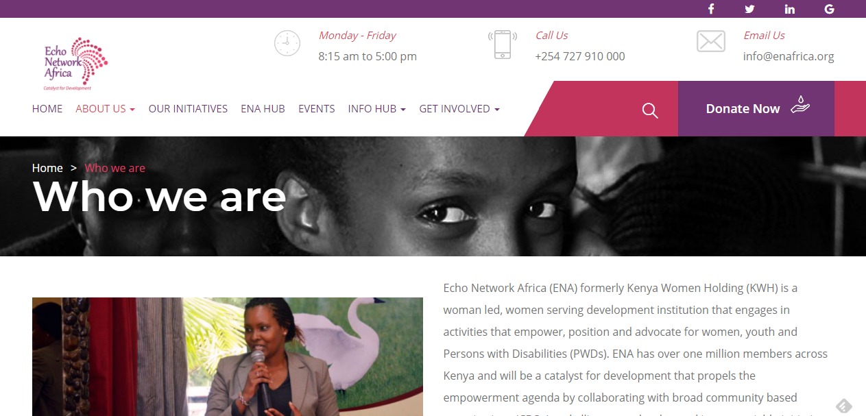 Echo Network Africa (ENA) formerly Kenya Women Holding (KWH) is a woman led, women serving development institution that engages in activities that empower, position and advocate for women, youth and Persons with Disabilities (PWDs). ENA has over one million members across Kenya and will be a catalyst for development that propels the empowerment agenda by collaborating with broad community based organizations (CBOs) and alliances to develop and innovate viable initiatives that enable women, youth and Persons with Disabilities to advance their security and prosperity.