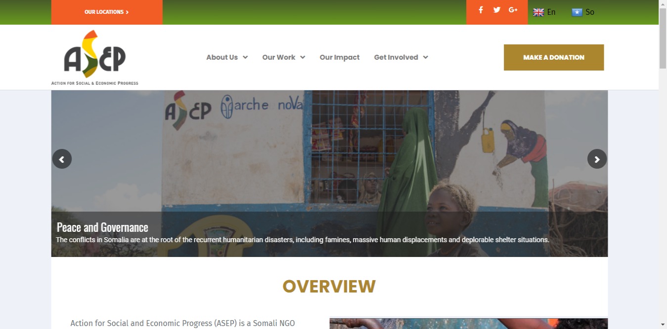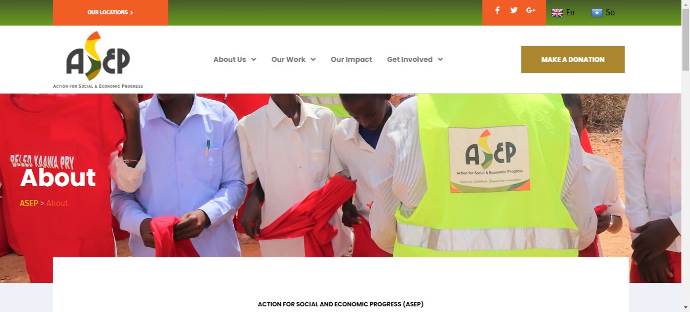Action for Social and Economic Progress (ASEP) is a Somali NGO active in Somalia for over 25 years. Since its establishment in 1995, ASEP has implemented numerous projects in the humanitarian and development core sectors and has gained significant knowledge and technical expertise in multiple sectors such as Water Sanitation and Hygiene (WASH), Livelihoods, Education, Protection, Peace and Governance, Emergency Response; and Climate Change Adaptation and Disaster Risk Reduction.
